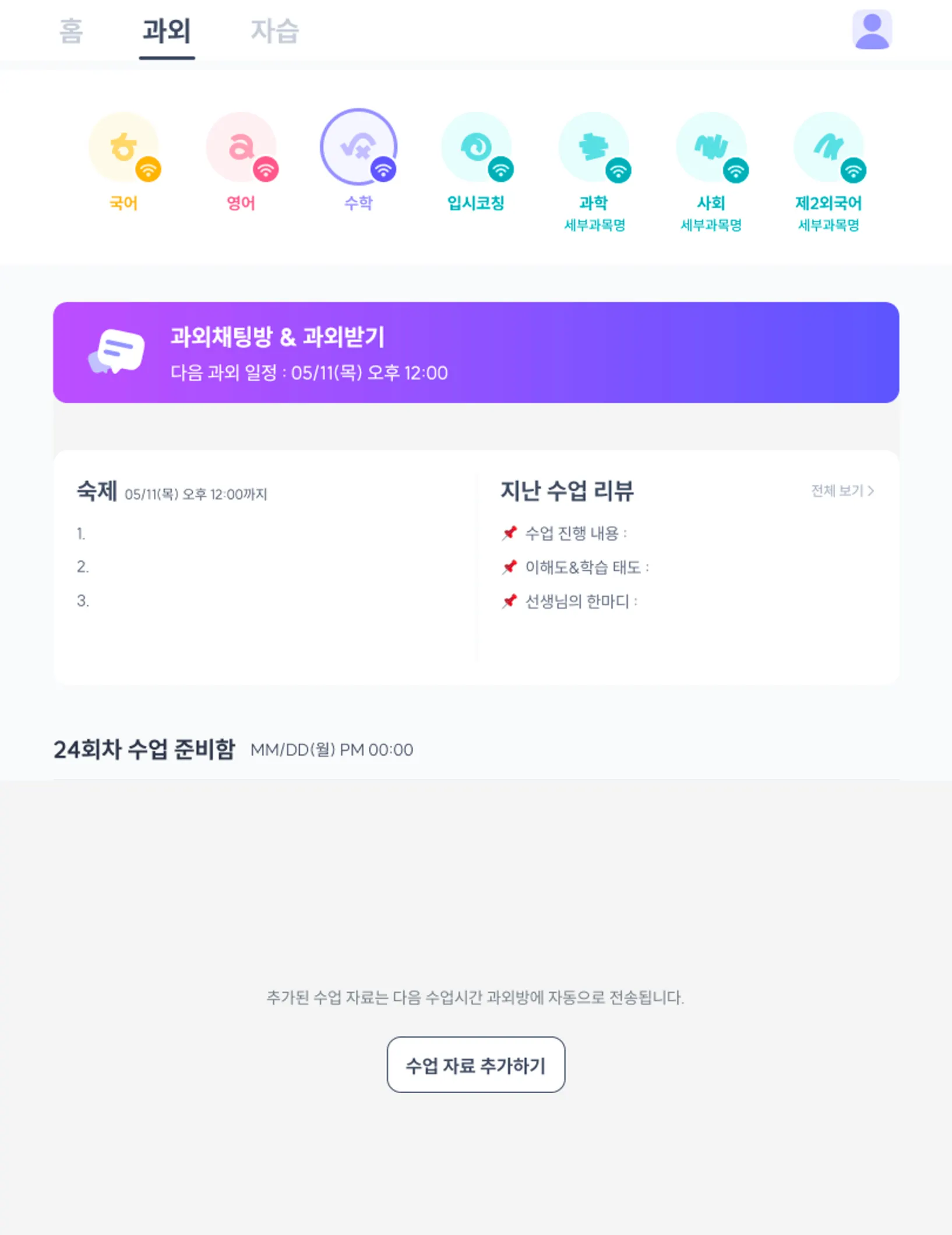 수업 준비함에 수업 자료를 추가하고 과외를 받을 수 있어요.
