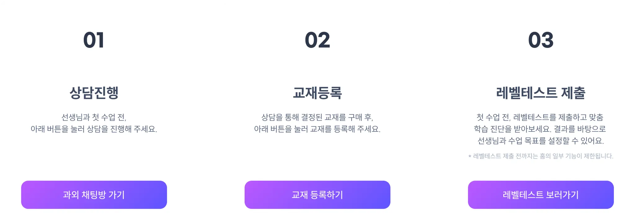 아래의 상담진행 - 교재등록 - 레벨테스트 제출을 순서대로 진행해 주세요.