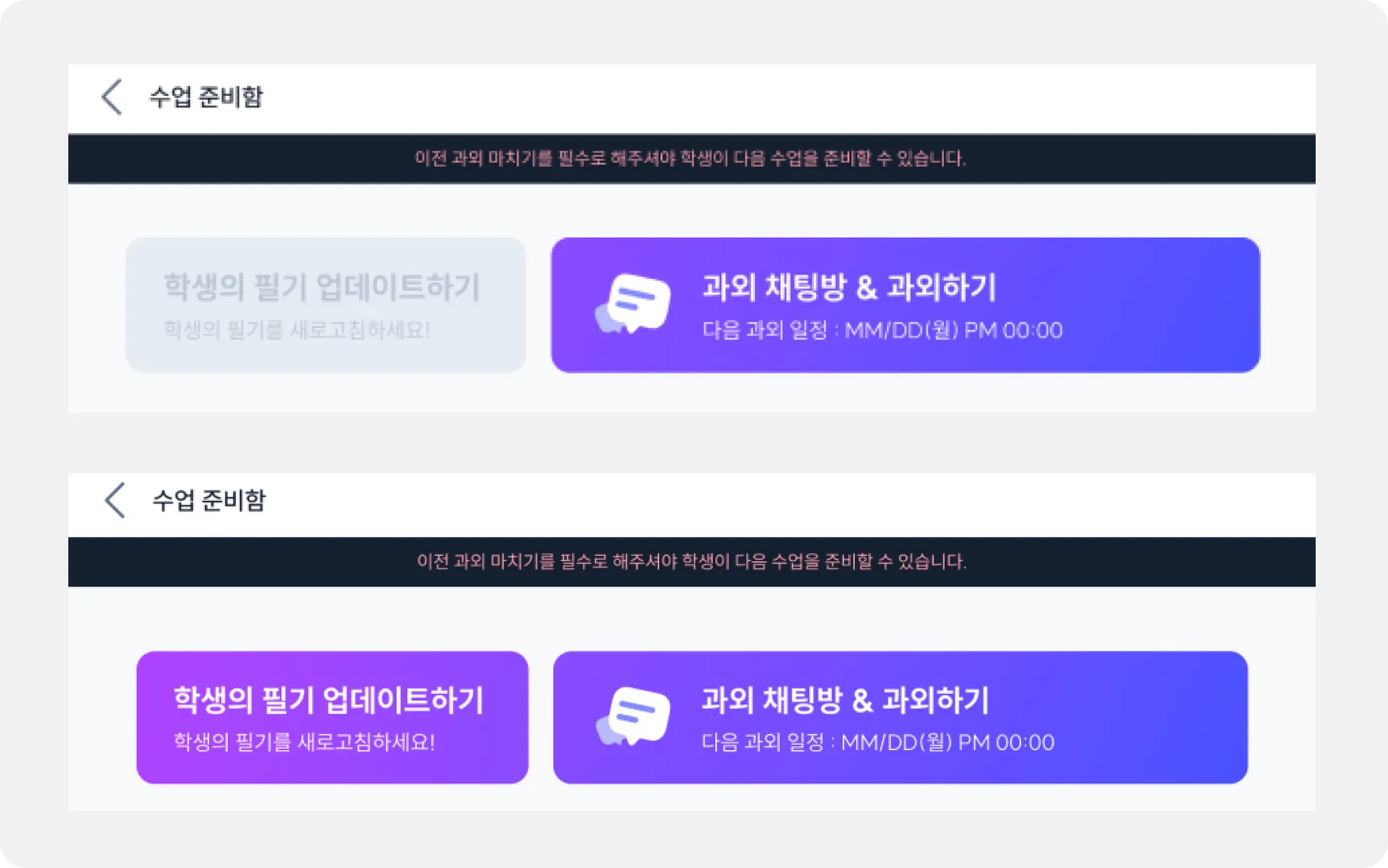 수업 준비함 - 과외 마치기 ‘요청하기’ - 자동으로 선생님께 과외채팅방에 요청 메시지 발송